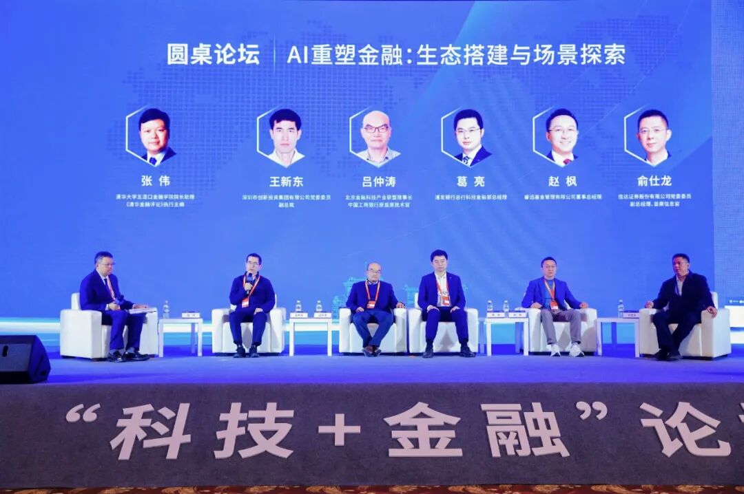 院长助理、《清华金融评论》执行主编张伟,北京金融科技产业联盟理事长,中国工商银行原首席技术官吕仲涛,浦发银行总行科技金融部总经理葛亮,深圳市创新投资集团有限公司党委委员、副总裁王新东,睿远基金管理有限公司董事总经理赵枫,信达证券股份有限公司党委委员、副总经理、首席信息官俞仕龙在圆桌论坛环节围绕“AI重塑金融:生态搭建与场景探索”分别发表观点,聚焦AI对金融行业的深层次改变分享最新思考并提出相关建议。