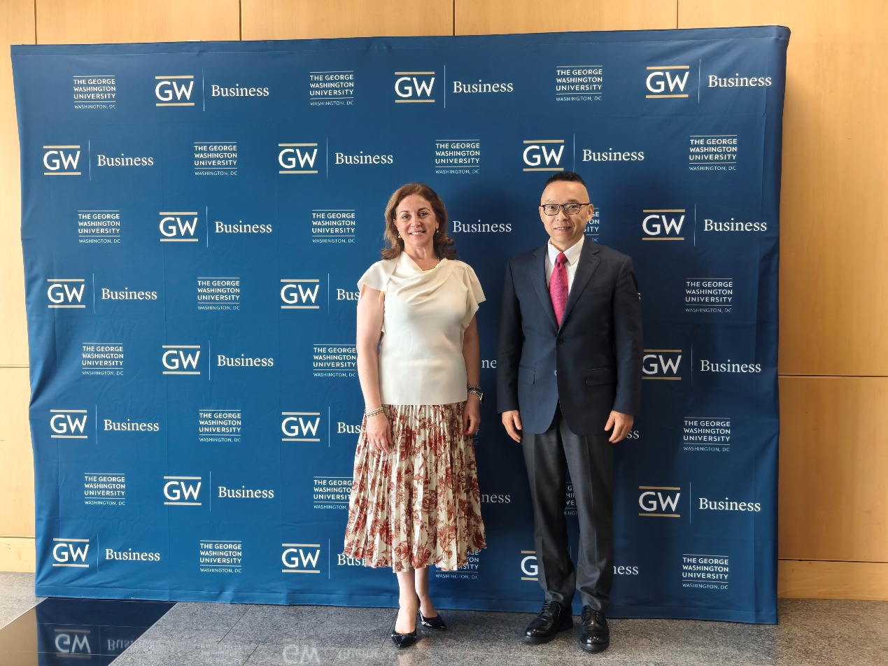 图为学院院长焦捷与乔治华盛顿大学院长谢文·耶尔泰金(Şevin Yeltekin)合影